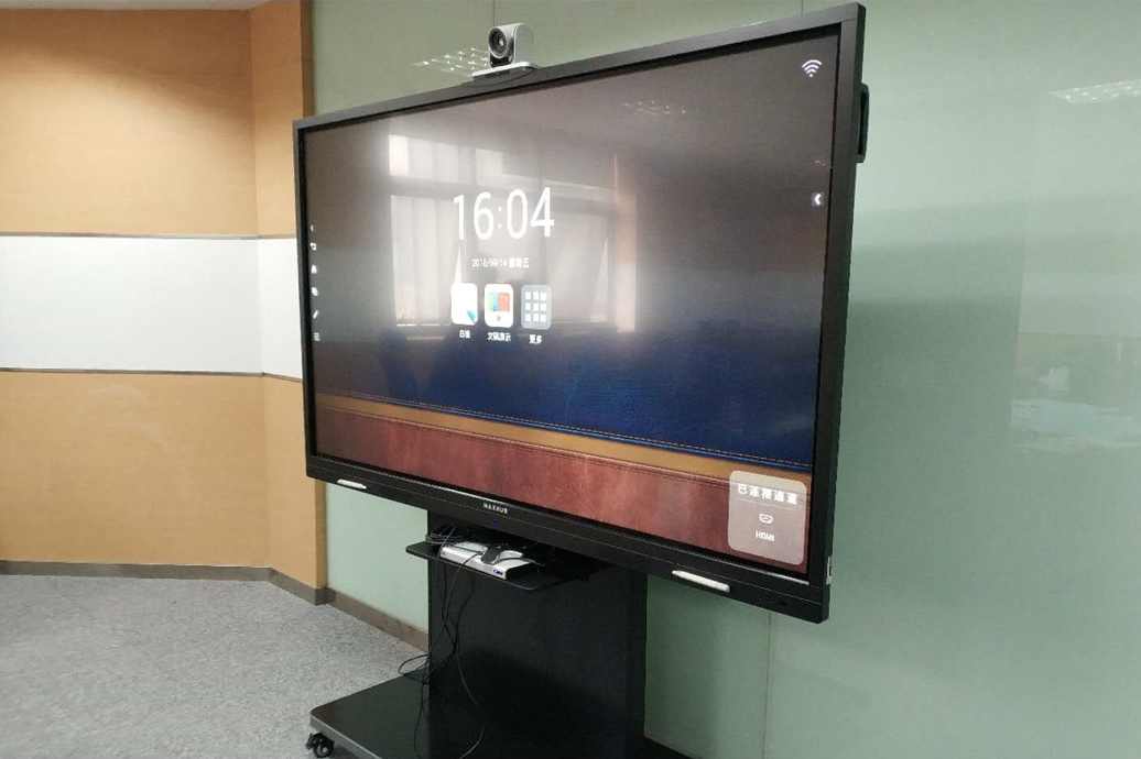 终效果:会议推车解决了石膏板隔墙无法挂装大型会议平板的承重问题,并且灵活移动的方式可以在不同会议室之间随意使用。